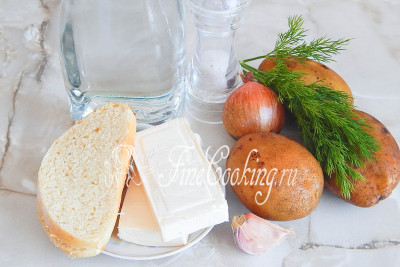 Для приготовления сырного супа-пюре с гренками нужен такой набор продуктов: вода, сырки плавленые, картофель, лук репчатый, зубчик чеснока, белый хлеб или батон (багет), укроп свежий, соль.