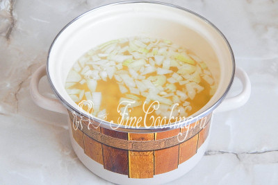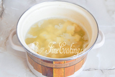 Закладываем в кипящую воду кусочки лука и картофеля. Варим суп на среднем огне до мягкости овощей – примерно 25-30 минут, и картошка с луком полностью сварятся.