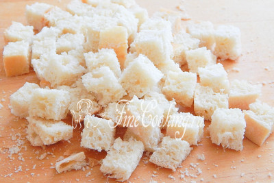 Белый хлеб нарезаем средними кубиками. Чеснок очищаем и натираем на мелкой терке. Аккуратно все перемешиваем и поджариваем на сухой сковороде до румяности хлеба. Крошки выбрасываем, а греночки снимаем со сковороды и перекладываем в отдельную посуду.